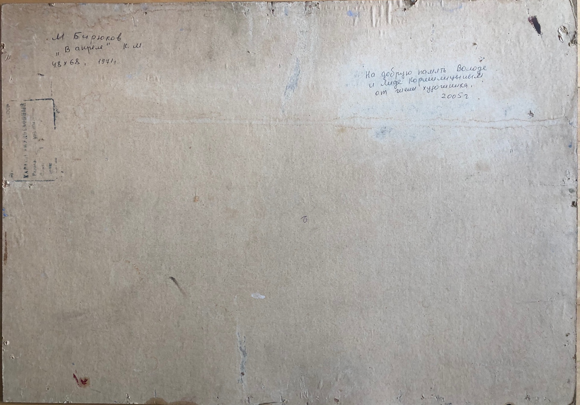На обороте дарственная надпись, сделанная рукой художника.