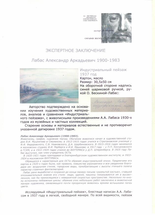 Александр Лабас — выдающийся российский художник, представитель русского авангарда 20-х–30-х годов, один из основателей группы ОСТ. Александр Лабас учился в СЦХПУ в Москве у С.В.Ноаковского, Д. А. Щербиновского в 1912-1917 гг., в частных студиях В. И. Мушкетова в Смоленске в 1908 г., Ф. И. Рерберга и И. И. Машкова в Москве в 1916 г., в ГСХМ в Москве у П. П. Кончаловского в 1917-1919 гг., Вхутемасе в Москве у Д. П. Штеренберга в 1921-1924 гг. Член-учредитель ОСТ в 1925 г. Преподавал в Екатеринбургском художественном институте в 1920-1921 гг., в Вхутемасе в Москве в 1922-1924 гг. (ассистент профессора К. Н. Истомина). Лабас находился в действующих частях Красной Армии на Дальнем Востоке в качестве художника Политотдела 3-й армии Восточного фронта в 1919-1920 гг. Работал в области станковой, театрально-декорационной и монументально-декоративной живописи (панно, панорамы и диорамы). Автор графических серий. Писал картины на темы транспорта, строительства и спорта, портреты, пейзажи, натюрморты. Придерживаясь тематики, обычной для ОСТ, заметно отличался по манере близостью Р.Дюфи: в центре внимания художника не предмет, а среда, вибрирующая, передающая движение (часто беспорядочное, "броуновское") содержащихся в ней элементов, однако не ипрессионистическая; рисунок очень обобщенный, контурно-плоскостный, но границы часто нарушены, цветовые пятна с ними не совпадают - это позволяет передать как проникновение в предмет, слияние с ним "среды", так и процесс движения. Лабас выбирал темы, которые требовали подчеркивания динамики - прежде всего "транспортные". Писал паровозы, пароходы, автомобили и трамваи, метро но больше всего дирижабли и аэропланы, которые мыслились символами прогрессивной современности и даже посланцами будущего ("Дирижабль", 1931). До последних дней жизни художник сохранил манеру и увлечения 1920-х гг., продолжая работать над темой авиации, которую воспринимал романтически. Он писал в конце жизни: "Я люблю работать с натуры, когда все в движении. Невольно поднимаю голову и вижу - набирает высоту созданная человеком чудесная птица - большой воздушный корабль с огромным количеством пассажиров, и рев его мощных моторов настойчиво напоминает, что мы живем в 70-х годах ХХ века".